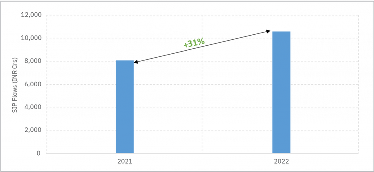 The simplicity of SIP investing has proven to be a great way to tide over market volatility that allows investors to cut through the noise. Over the last few years, Indian investors have increasingly adopted the more disciplined approach of SIP investing. This has led to the average monthly SIP flows into Equity schemes registering a stellar growth of 31% from ~₹8,000 Crs in 2021 to ₹10,500 Crs in 2022.