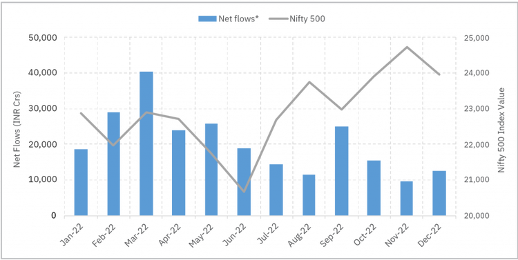 Source: MOAMC Research, AceMF, niftyindices; Data as of 31-Dec-2021 to 31-Dec-2022; *Net flows estimated using NAV-adjusted AUM and include both SIP and Lumpsum flows.