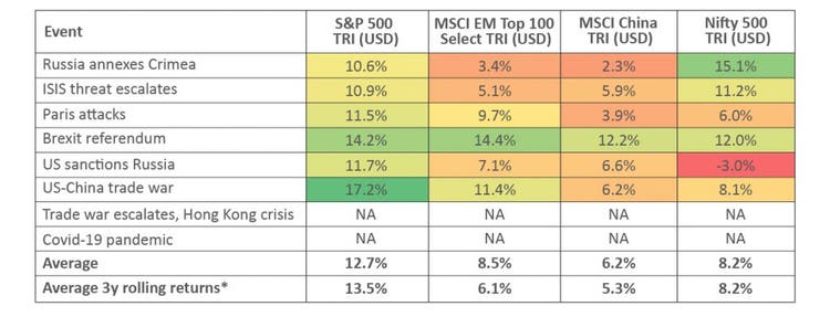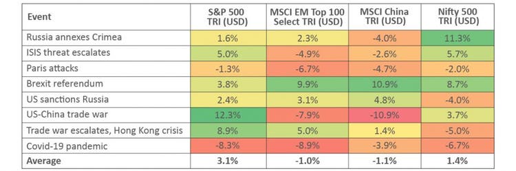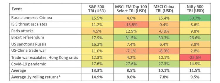 We can see that both diversified stock market indices (S&P 500 and MSCI EM Top 100 Select) have remained relatively unscathed from most of these geopolitical events. However, the country-specific indices (Nifty 500 and MSCI China) have been more volatile, showing stronger reactions to negative (and positive) events. The table below summaries the performance (in absolute returns) of these four indices during each geopolitical event.