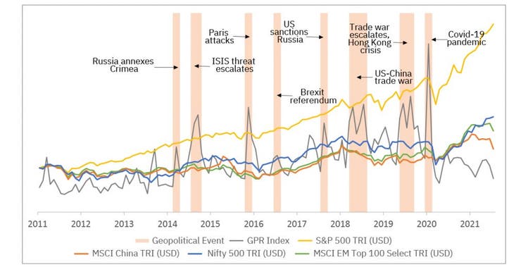 The term geopolitical risk can be broadly defined as the risk associated with political turmoil, military conflict, inter-country diplomatic tensions, and acts of terrorism. Over the last ten years, investors have been exposed to several major geopolitical events like Brexit, the US-China trade war, and the Covid-19 pandemic. With the frequency of such events increasing, investors remain cautious of the impact of geopolitical fallout on their investments.