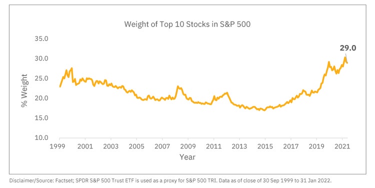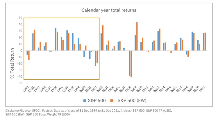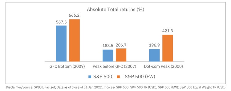 The graph below tells us that the market returns were much more skewed till the dot-com bubble era (as highlighted). However, in the last ~20 years, we can see that the S&P equal-weighted index has either risen/fallen more than the market-cap-weighted index, which suggests that the returns have been more broad-based than a few stocks contributing to the return in S&P 500.