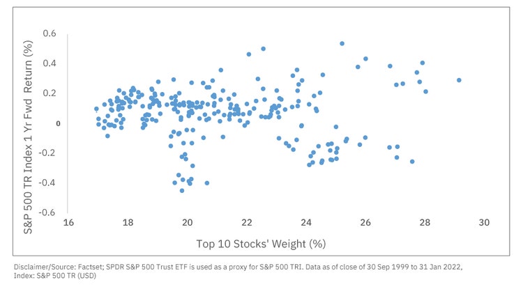 The x-axis on the above chart shows the sum of the weight of the top 10 stocks in the S&P 500 Indexat every month-end for the past 20 years. The y axis shows the 1-year forward index total returns starting each month-end for the same period. We ran a linear regression and found the coefficient of determination (R2) zero.