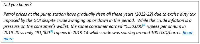 Russian invasion into the soil of Ukraine pushed crude prices to a new high, which was most likely due to markets pricing in Russian supply disruptions into Europe. This acts as fuel to already hot inflation in the region. From an Indian context, the fear of the ongoing war between Russia and Ukraine can be felt in the stock market. India’s dependence for imported petroleum has indeed increased over the years. For instance, in 1998-99, net imports of petroleum products were 69% of total consumption, increasing to around 95% [1] in 2020-21.