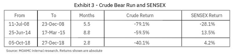 Similarly, a bear run in crude does not necessarily imply phenomenal outperformance or negative stock market returns. Only once in recorded history, we find the stock market generating negative returns when crude prices nosedived because it coincided with GFC yet again. In all other instances, the stock market generated positive returns in single and lower double digits, contrary to the widespread belief that a bear run in crude oil prices will stoke the stock markets higher.
