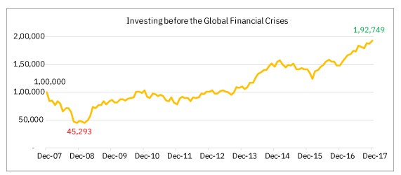 Source/Disclaimer: www.bseindia.com; S&P BSE SENSEX price returns index data in INR. Data as of close of 28-Feb-1979 – 30-Nov-2020 To help visualise this better, let’s take an example. As shown in the chart below, during the global financial crises of 2008, Nifty 50 TRI had crashed ~54% in one year compared to its previous peak. This means that an investment of 1 lakh, would’ve reduced to 45,293. However, in about three years (Oct 2010), the investor would’ve recovered from losses. If he had managed to wait a little longer, than in 10 years (i.e. Dec 2017) the value would’ve been almost double the invested amount (at 1,92,749) at ~7% CAGR. Refer to the below chart for a better understanding. Now investing in equity mutual fund, the 7% CAGR looks sub-par; however, remember the assumption investing just before the Global Financial Crisis at the end of Dec 2007.