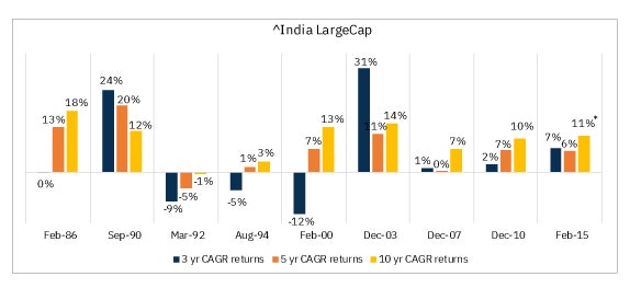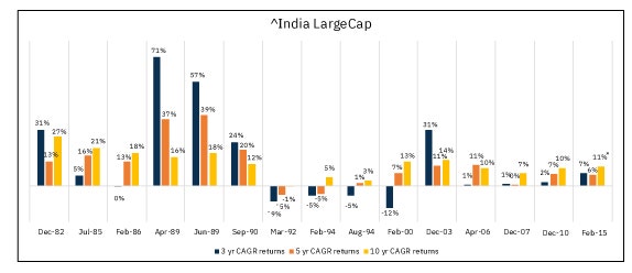 Investing just before every crash of >20% & correction of >10% since 1979To give a better perspective of the previous example, we have extended the study to include all the previous crashes since 1979. We continue with our assumption that the investor invests only at the market peak just before a crash. We will then calculate the CAGR returns for 3/5/10 years to help understand historical returns for such investors. A simulation ‘India LargeCap’ was run which connects performance of S&P BSE Sensex PR Index from April 1979 to June 1999 & Nifty 50 Total Returns Index from July-1999 to present. It is done to capture the longer performance history of India’s stock market.