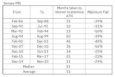 Similar to what we saw earlier, the variability in returns is high during the ‘80s and ‘90s. However during the last two decades (i.e. during 2000-2020) we experienced relatively lesser volatility. Also, the average time taken for a correction (fall >10%) to recover to its previous peak is ~1.5 years (18 months).