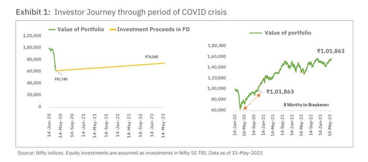 Consider this case of my friend had invested ₹1,00,000 in equities in January 2020. Unfortunately, the COVID-19 pandemic hit shortly after, causing a steep market crash of ~40%, As a result, value of his investments dropped to ₹60,000. Fearing further losses, he exited equities and invested his money in a fixed deposit at 6%. The lasting memory of that crash made him fearful, and he refrained from re-entering the equity market, showcasing availability bias in action. Now, let’s fast forward to the present day, 31st May 2023. If my friend had stayed invested in equities, he would have not only recovered his initial investment but also earned an additional ₹56,000 in gains. In contrast, his decision to stay out of the equity market and opt for a fixed deposit resulted in a loss of ₹26,000 (after accounting for the interest income earned from the fixed deposit)